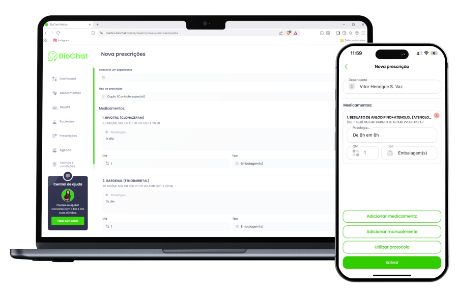 Por isso, o BioChat integra em seu ecossistema um recurso de prescrição digital moderna e prática, disponível no celular e no computador.